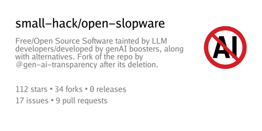 SwooshBakery624 [they/them]@programming.devEnglish · 3 days agoOpen Slopwareplus-squarecodeberg.orgexternal-linkmessage-square2linkfedilinkarrow-up181arrow-down110