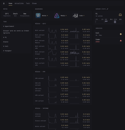 Glance is cool I love the style and it is well implemented so you can easily add custom HTML and CSS which is what I did to do this custom monitoring. Data are gathered from iptables counters that periodically reset, the hardest and most interesting part was to understand networking and to track packet through applications based on if they were port binded or reverse proxyed (I use Caddy for web facing app I want access to without a VPN). I’ll definitively check more advanced solution, I just needed to do it manually first to actually understand what I’m doing (which took me like 2 weeks until I finally found this gem on ArchLinux wiki https://www.frozentux.net/iptables-tutorial/iptables-tutorial.html)