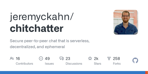 perishthethought@lemm.ee to Privacy@lemmy.mlEnglish · 8 months agojeremyckahn/chitchatter: Secure peer-to-peer chat that is serverless, decentralized, and ephemeralgithub.comexternal-linkmessage-square9linkfedilinkarrow-up169arrow-down12file-text