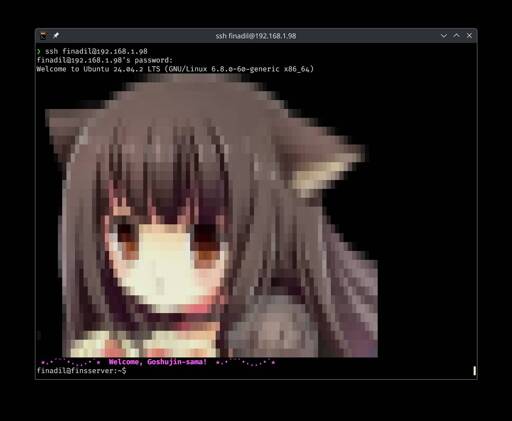 Has my motd gone too far? It loads a random ANSI catgirl from a folder. I use arch btw, server runs minimized Ubuntu Server.