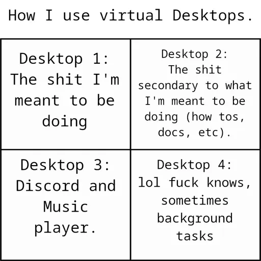 I respect anyone who does use virtual desktops because I acknowledge that if you master the workflow, it can be more efficient if you have more than like 5 or 6 tasks going at once (vs 4 monitors), however I will die on the hill of never ever using them.