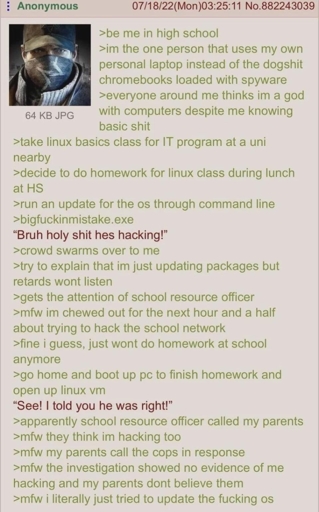 individual@toast.ooo to linuxmemes@lemmy.world · 4 months agoAnon updates GNU/linuxlemmy.worldimagemessage-square64linkfedilinkarrow-up1530arrow-down135file-text