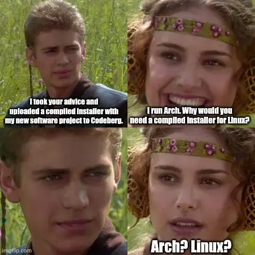 *-patch-binbrowser packages. I must admit that I don’t really find it funny. But maybe I too am missing the point here. ¯\_(ツ)_/¯Anyway, in case you don’t know, and wish to use Arch at some point, the content on AUR is user submitted, and hence security cannot be guaranteed. People do report malicious packages, and it’s safe in general. But always read the PKGBUILD before installing anything, just in case something silly is going on.