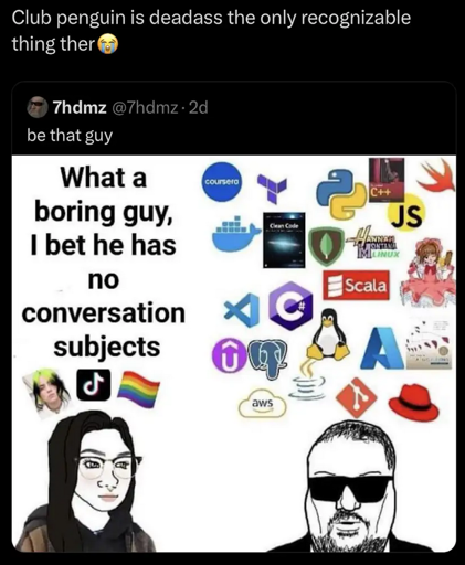 minus-squareCethin@lemmy.ziplinkfedilinkEnglisharrow-up24arrow-down1·3 months agoWell, the punchline of this one is that they think the Linux logo is Club Penguin, but yeah, the original (if it ever existed on its own) is bad.