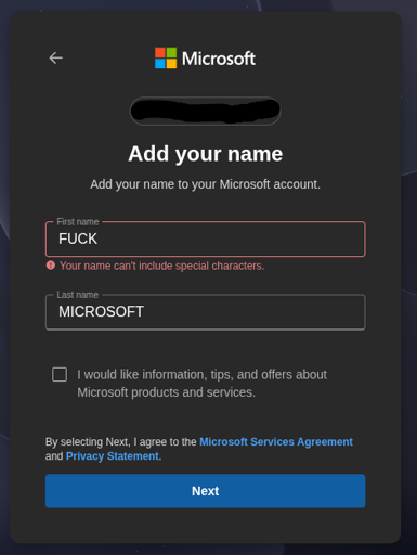 I tried putting the name on my Microsoft account as “FUCK MICROSOFT” but it said “Your name can’t include special characters.” changing it to “Fuck Microsoft” gave the same issue. Only when I made up a fake name did it accept it.