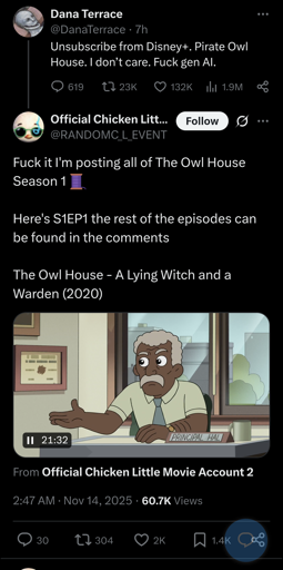 LiamBox@lemmy.ml to Piracy: ꜱᴀɪʟ ᴛʜᴇ ʜɪɢʜ ꜱᴇᴀꜱ@lemmy.dbzer0.comEnglish · 18 days ago'The Owl House’ creator Dana Terrace situation with Disney+ positive views on AI generated contentlemmy.mlimagemessage-square53linkfedilinkarrow-up1422arrow-down13
