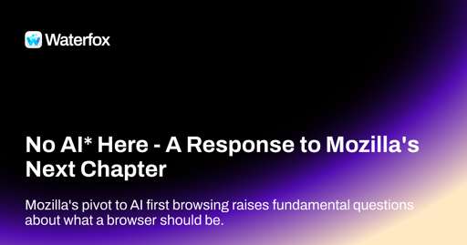 Nutomic@lemmy.ml to Privacy@lemmy.mlEnglish · 21 days agoNo AI* Here - A Response to Mozilla's Next Chapter - Waterfox Blogwww.waterfox.comexternal-linkmessage-square54linkfedilinkarrow-up1242arrow-down16