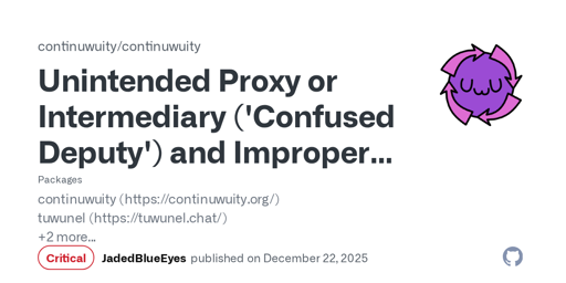 Jade@programming.dev to Selfhosted@lemmy.worldEnglish · 23 days agoUnintended Proxy or Intermediary ('Confused Deputy') and Improper Input Validation in Conduit-derived homeserversgithub.comexternal-linkmessage-square1linkfedilinkarrow-up127arrow-down10