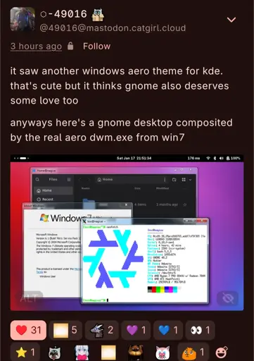 They are making even more cursed stuff but I haven’t found a download yet… But they managed to get the taskbar to show up https://mastodon.catgirl.cloud/@49016/115912856935158763 8hours ago from me commenting
