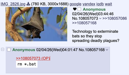 minus-squarerumschlumpel@feddit.orglinkfedilinkarrow-up29arrow-down1·edit-214 days agoI think we need sudo rm -r *.bat sudo find -name "*.bat" -delete for this one.
