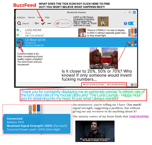 This bastard of an app manages to expose too much of the underlying processes and logic, of which I don’t care, in the utterly uninformative format. The OP forgot to mention that upon first pairing my headphones, I have to fend off three different notifications about ‘auth requests’, that provide me with no explanation what happens if I do or don’t satisfy said requests. These also reappear after the headphones disconnect for some inexplicable reason, until I give up on learning further details and click ‘always auth’. Which seems to help with the disconnections. Apparently some audio profiles are also occasionally unavailable unless I appease the blue fucker with ‘always auth’.