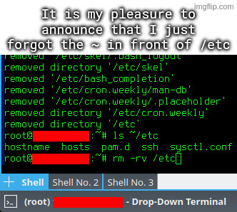 I went on to rm -rv ~/etc, but I quickly typed rm -rv /etc instead, and hit enter, while using a root account.