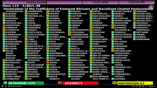 Yesterday, a Declaration of the trafficking of enslaved Africans and Racialized Chattel Enslavement of Africans as the Gravest Crime against Humanity was voted at UNO. As usual, Israel and the USA voted against. How did your country vote? Any thoughts about it?