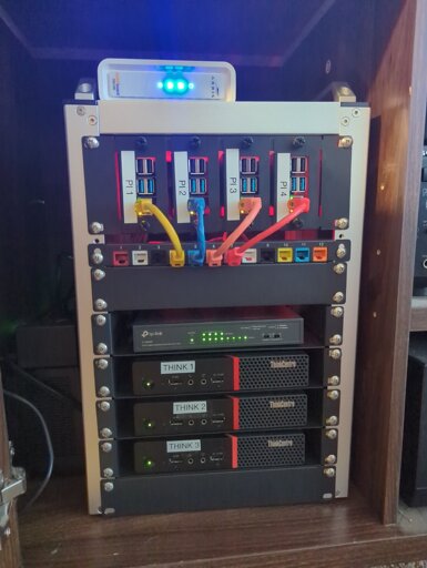 The Lenovo Thinkcentre M715q were $400 total after upgrades. I fortunately had 3 32 GB kits of ram from my work’s e-waste bin but if I had to add those it would probably be $550 ish The rack was $120 from 52pi I bought 2 extra 10in shelves for $25 each the Pi cluster rack was also $50 (shit I thought it was $20. Not worth) Patch Panel was $20 There’s a UPS that was $80 And the switch was $80